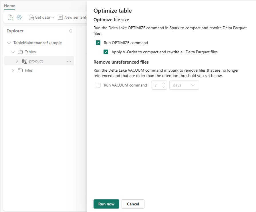 - Apply bin-compaction, V-Order, and unreferenced old files cleanup.