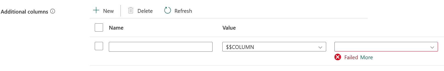 | Additional columns | Add additional data columns to store source files' relative path or static value. Expression is supported for the latter. | • Name • Value |
