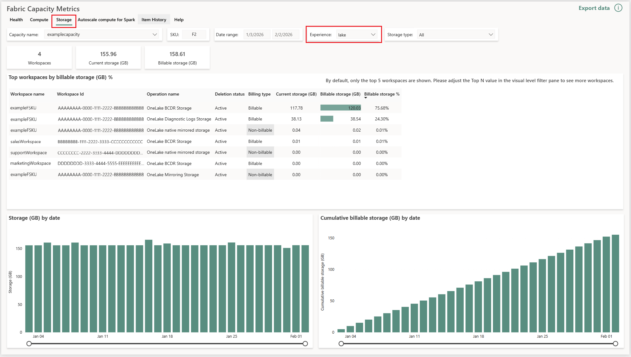 If you're a capacity admin, you can view your storage consumption in the Fabric Capacity Metrics app. In the Fabric Capacity Metrics app, open the Storage tab and use the Experience drop-down menu to select lake to see the cost of OneLake storage. If you have multiple workspaces in the capacity, you can see the storage per workspace.