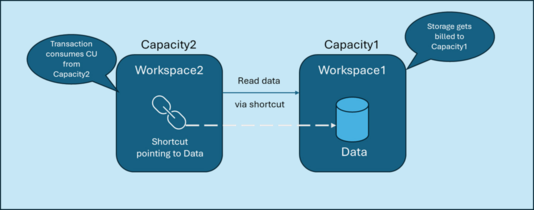 If Capacity1 is paused and Capacity2 is active, you can't read the data in Workspace1 (Capacity1) but you can still use the data by using the shortcut in Workspace2. In both cases, as the data is still stored in Capacity1, storage costs remain billed to Capacity1.