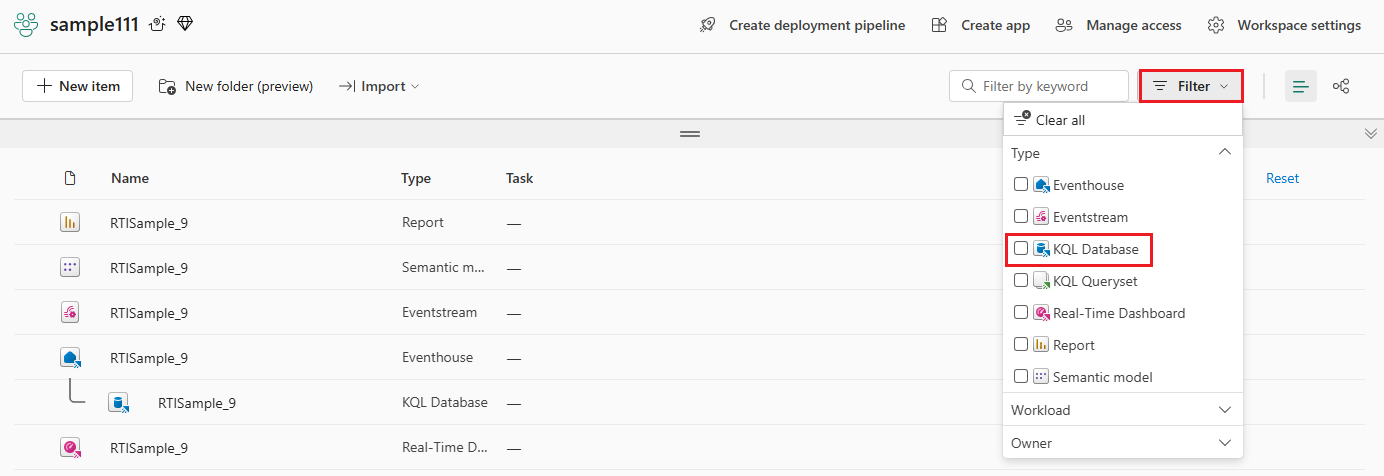 In the ribbon, select Filter > KQL Database.