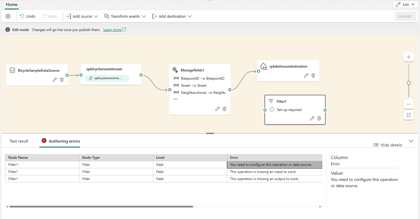 You can use the event processing editor (the canvas in Edit mode) to transform data into various destinations. Enter Edit mode to design stream processing operations for your data streams.