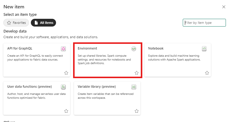 - Role of Admin, Contributor, or Member in the workspace. This permission level is needed to create items such as an Environment.