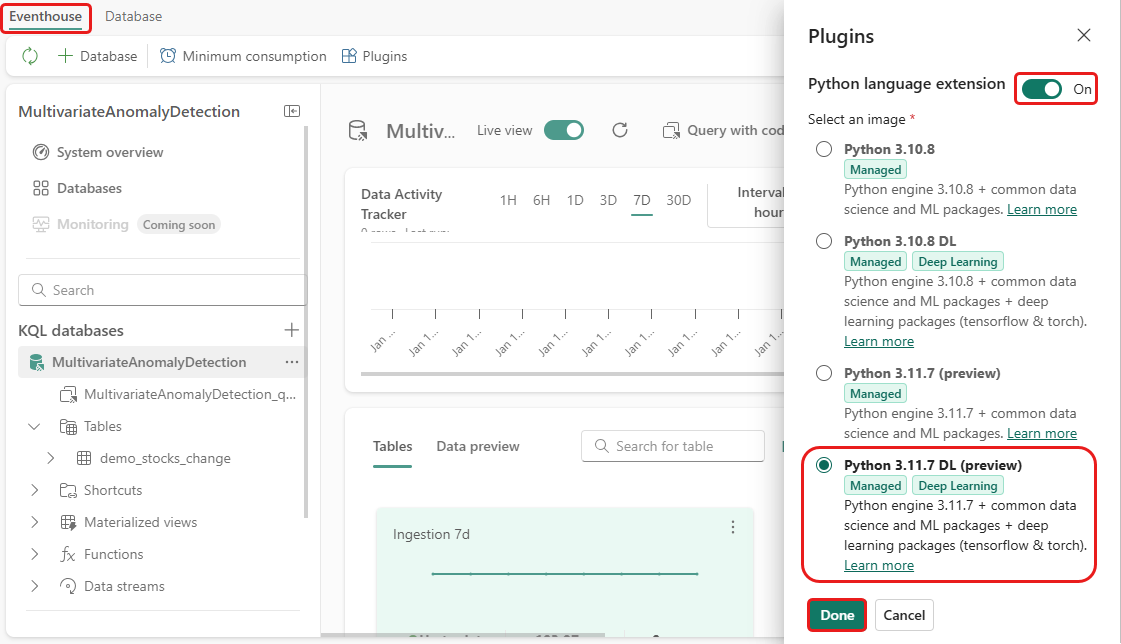 In this step, you enable the python plugin in your Eventhouse. This step is required to run the predict anomalies Python code in the KQL queryset. It's important to choose the correct image that contains the time-series-anomaly-detector package.