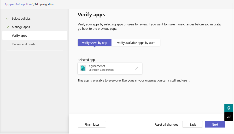 Verify the app availability for the users on the next page. In the following three tabs, it shows a list of apps from your Org-wide app settings and the app permission policies that you choose to migrate.