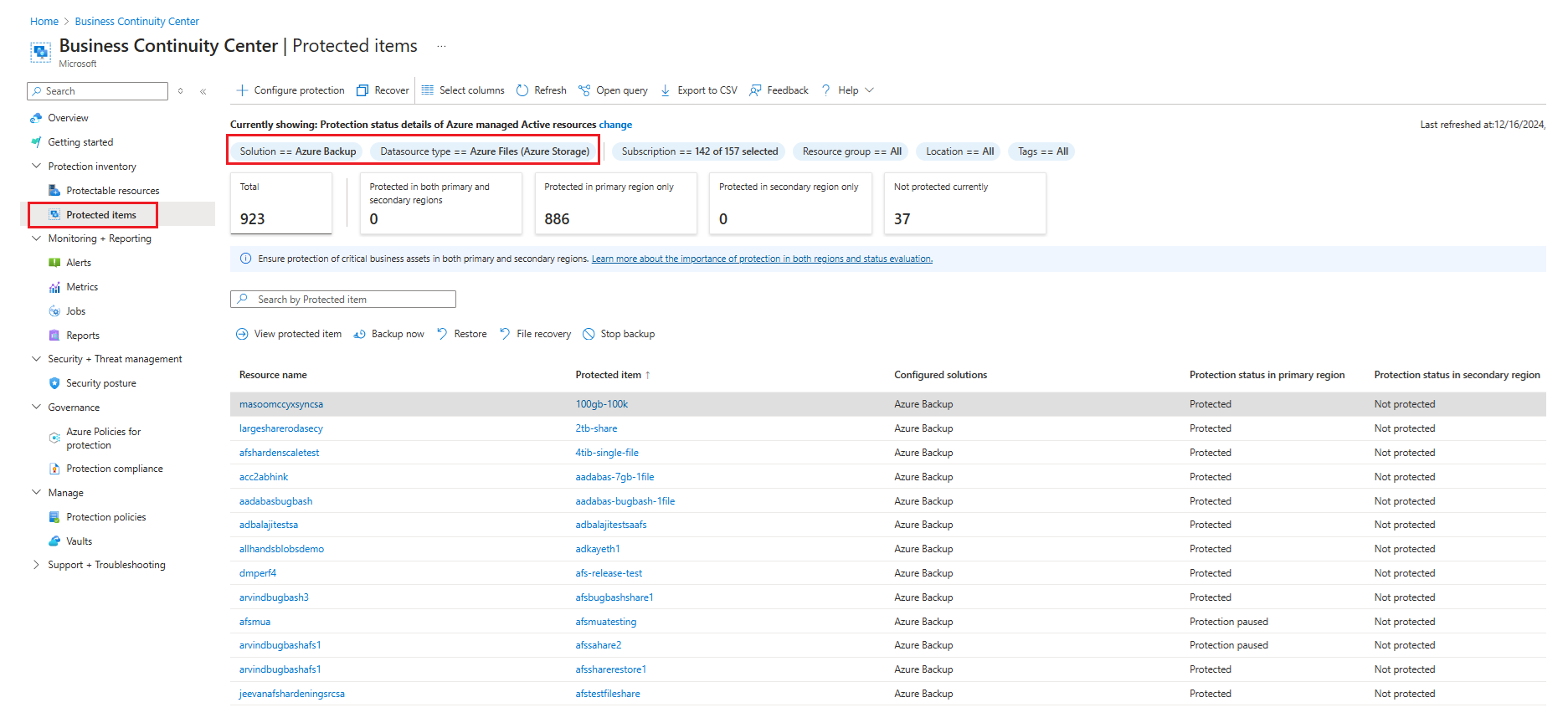 Go to Business Continuity Center > Protected Items, and then select Azure Backup as a Solution and Azure Files (Azure Storage) as the Datasource type.