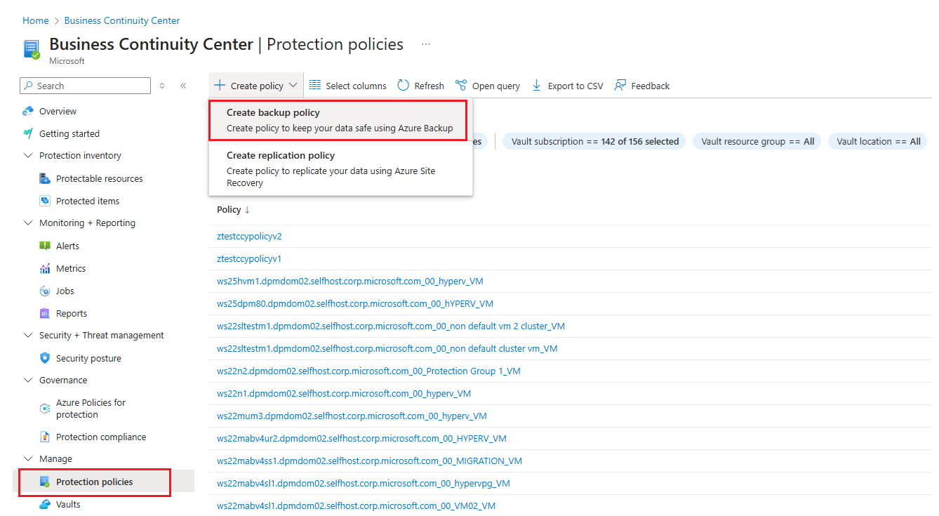Go to Business Continuity Center > Protection policies, and then select + Create Policy > Create Backup Policy.