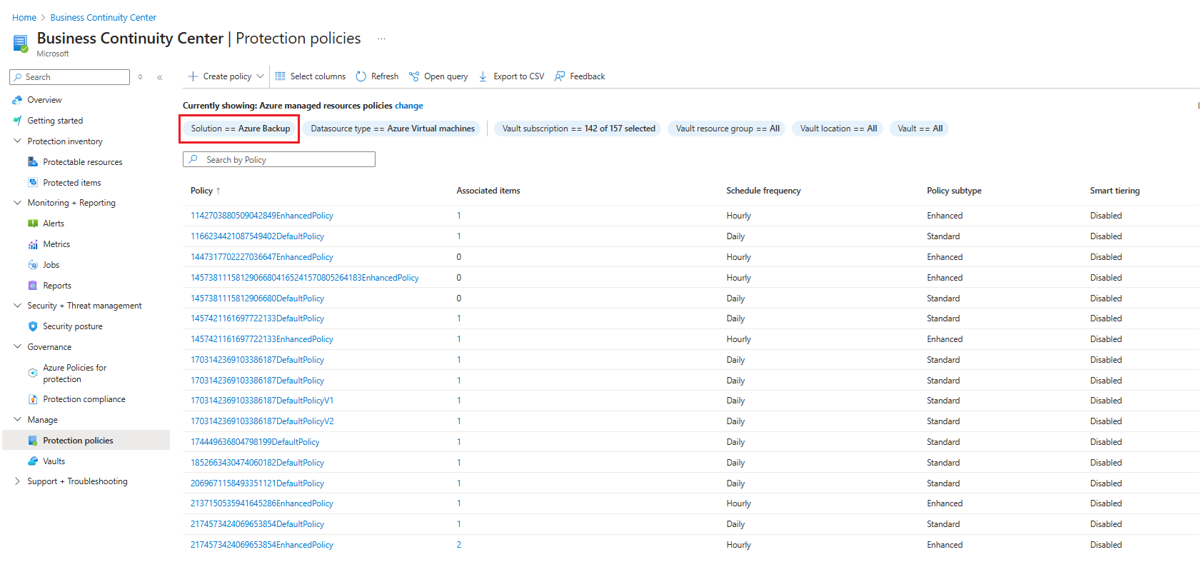Go to Business Continuity Center > Protection policies under the Manage section, and then select Azure Backup as a solution.