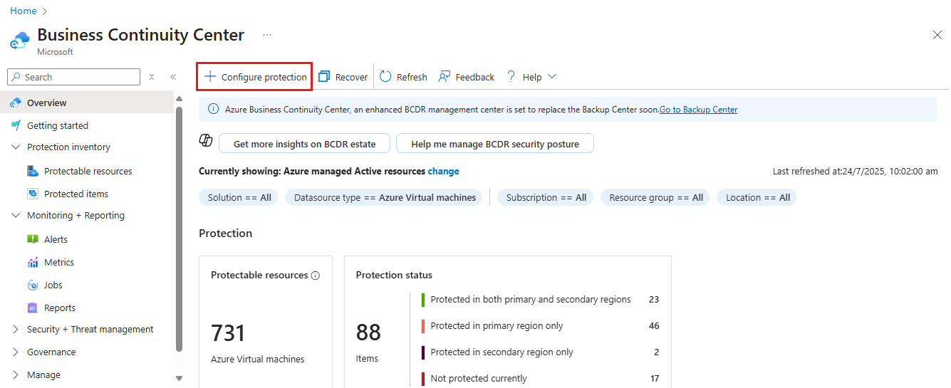 Go to Business Continuity Center and select + Configure protection.