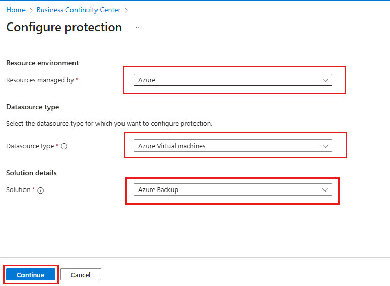 On the Configure protection pane, select Resource managed by as Azure, Datasource type as Azure Virtual machines, Solution as Azure Backup, and then select Continue.