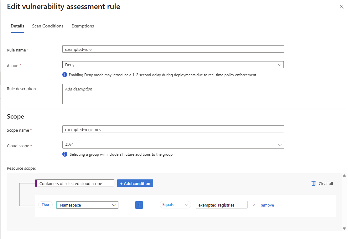 Configure exemptions during rule creation. They apply to audit and deny rules.