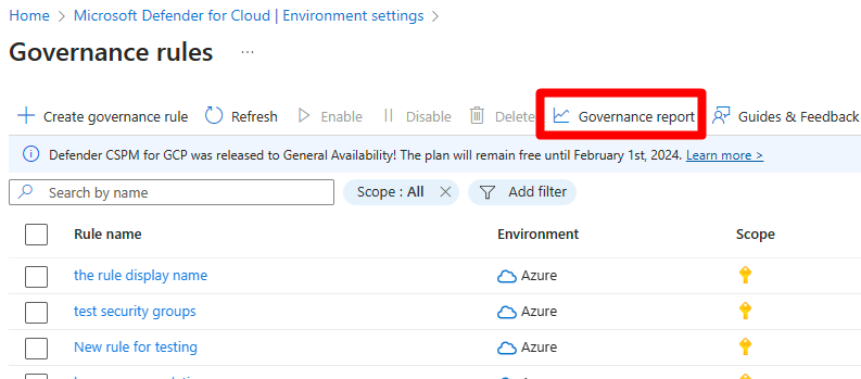 Go to Microsoft Defender for Cloud > Management > Environment settings > Governance rules > Governance report.