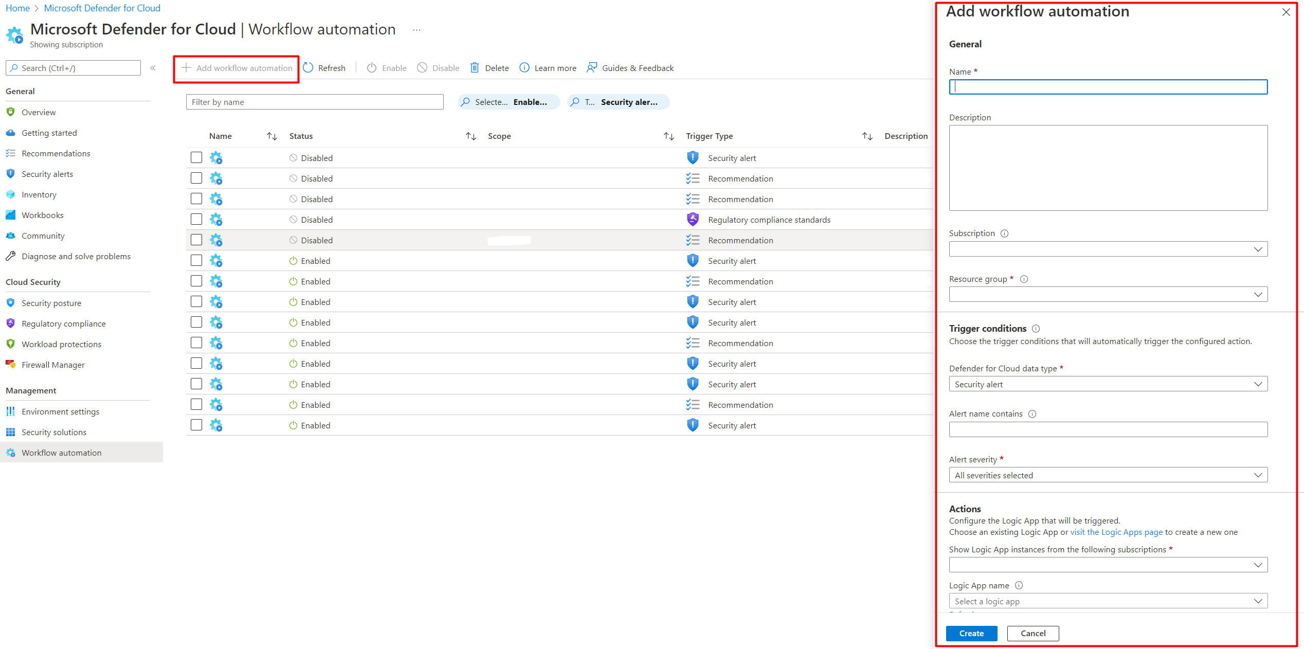 On this page, you can create new automation rules or enable, disable, or delete existing ones. A scope refers to the subscription where the workflow automation is deployed.