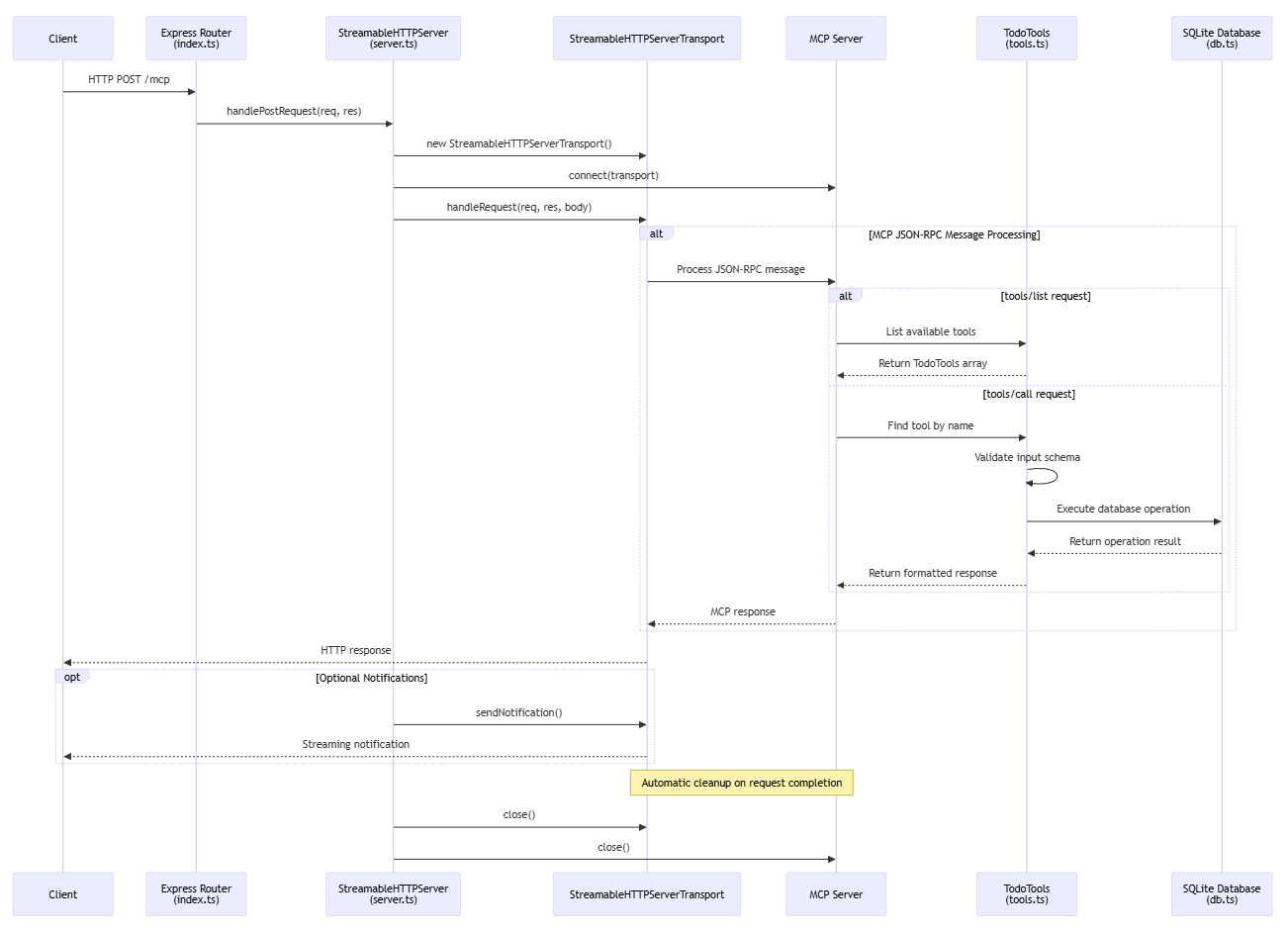 The following diagram illustrates the complete request journey from the client to the MCP server and back, including tool execution and database operations: