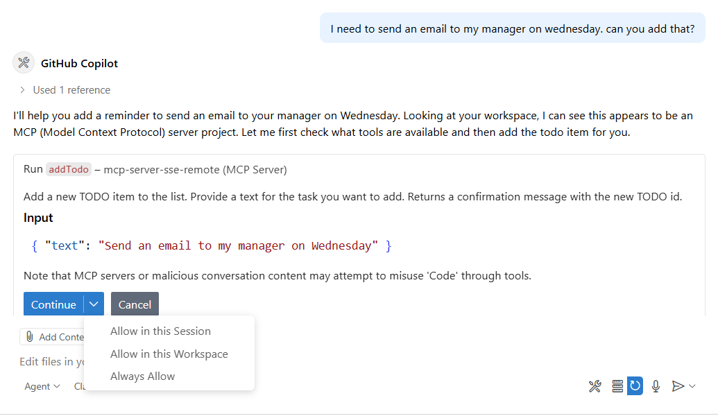 By default, when a tool is invoked, you need to confirm the action before the tool runs. Otherwise, tools might run locally on your machine and might perform actions that modify files or data.