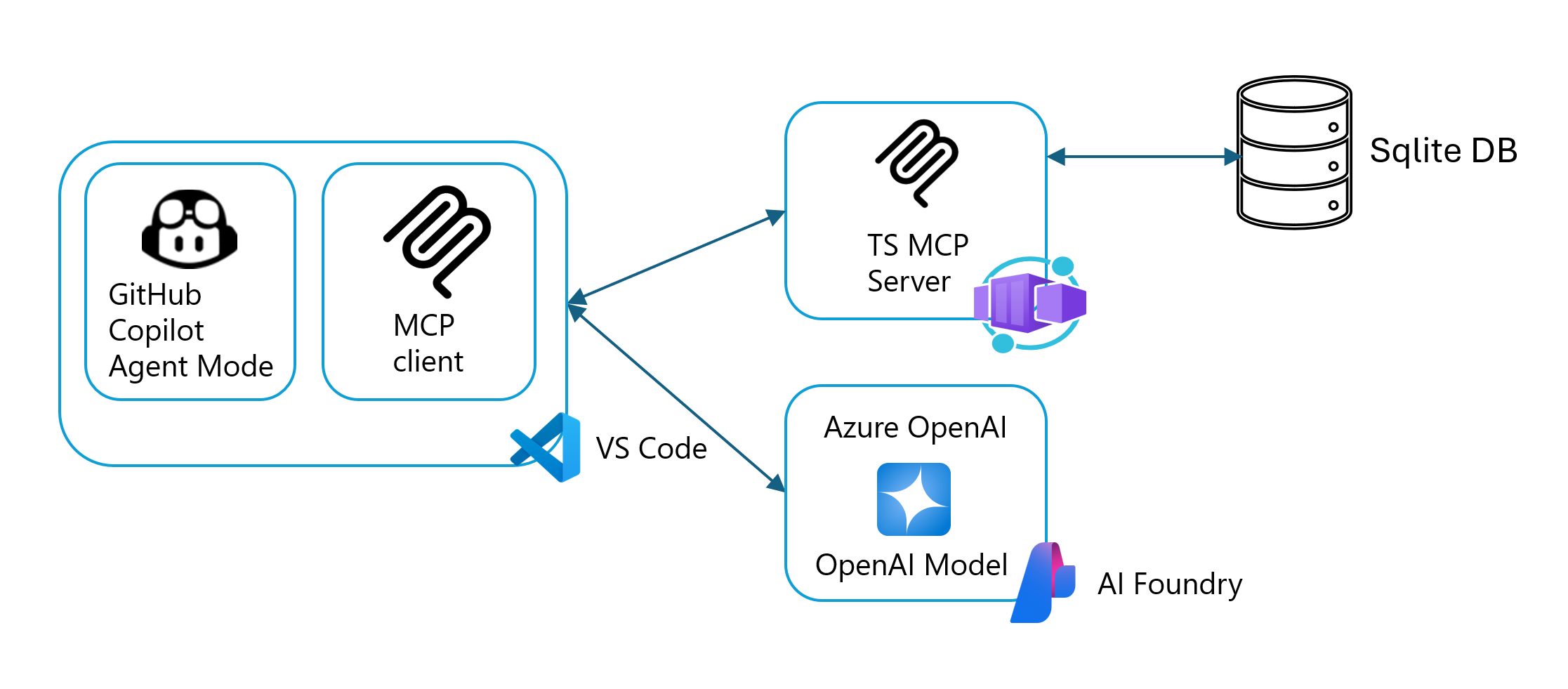 The MCP server runs as a containerized app on Azure Container Apps (ACA). It uses a Node.js/TypeScript backend to provide tools to the MCP client through the Model Context Protocol. All tools work with a backend SQLite database.