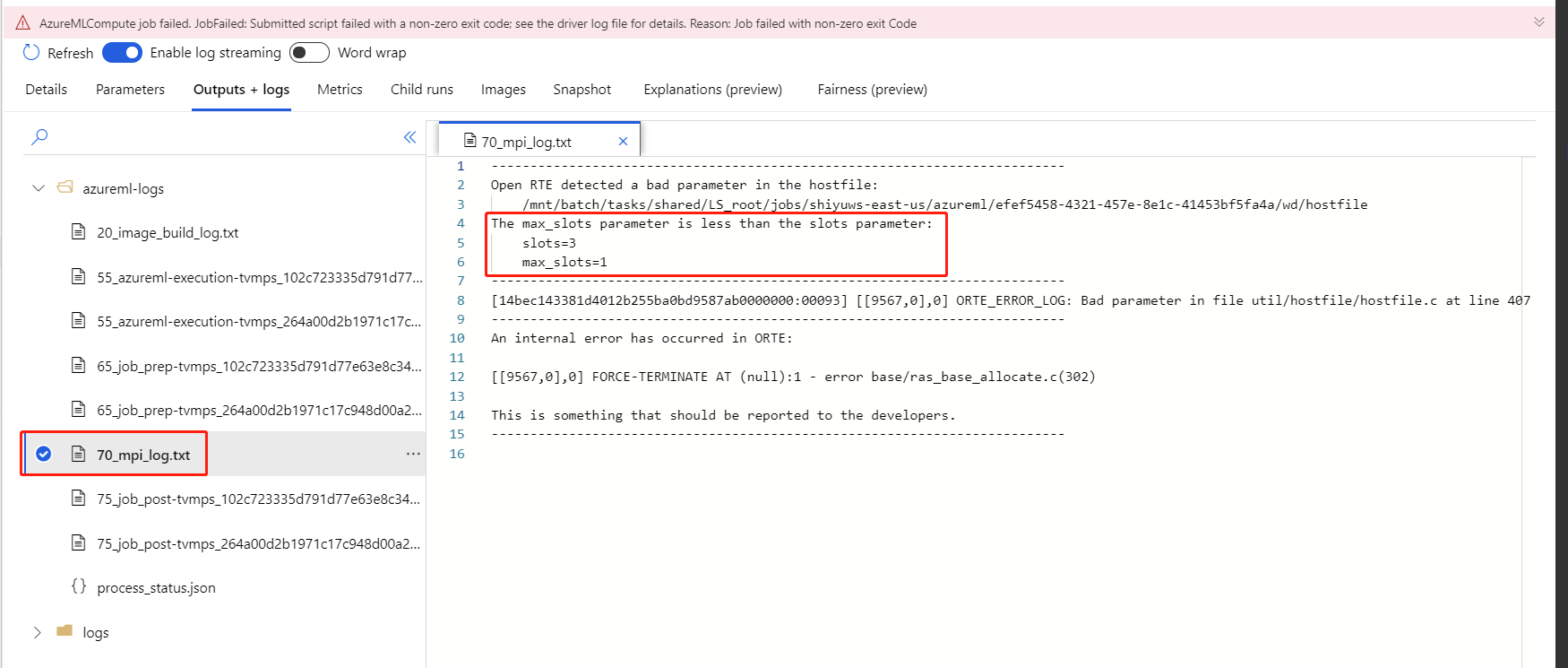 If the component enabled distributed training fails without any 70_driver logs, you can check 70_mpi_log for error details.