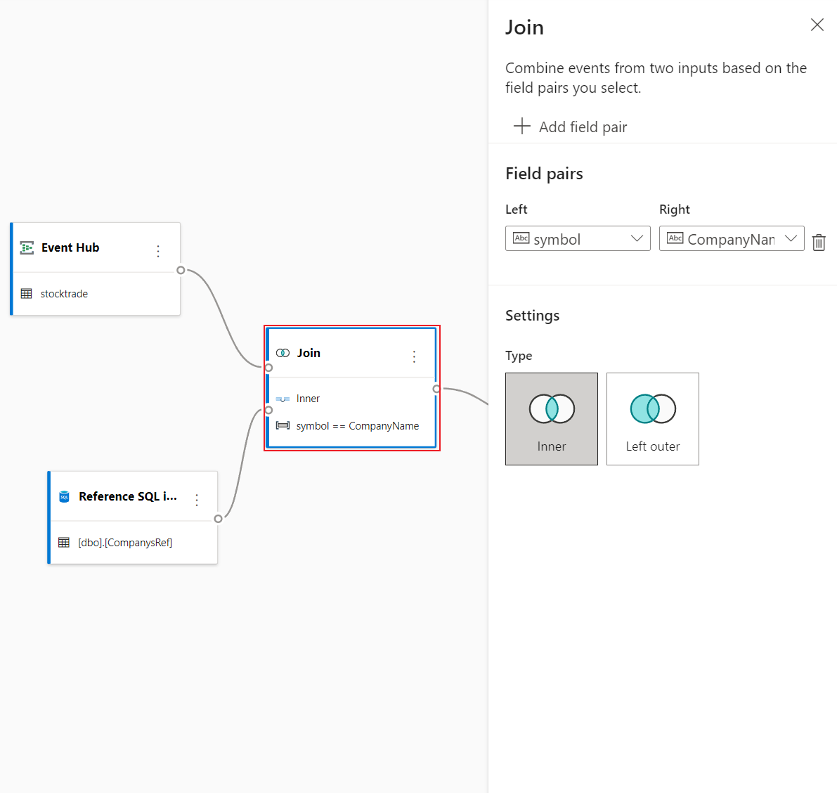 Select the Join tile. In the right configuration panel, choose a field from each input to join the incoming data from the two inputs.