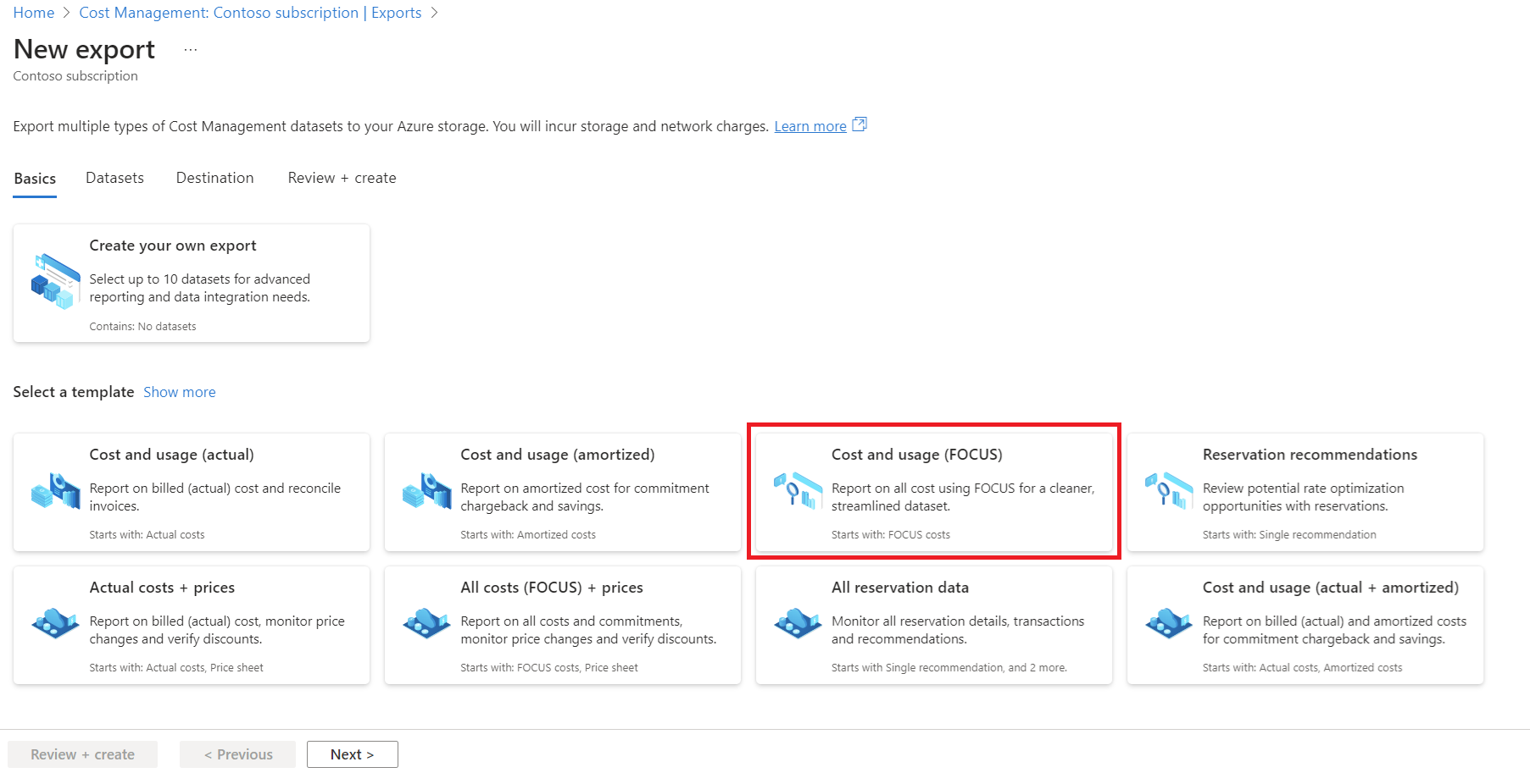 Since we're creating a workspace optimized for FinOps, we export cost data using the FinOps Open Cost and Usage Specification (FOCUS), a provider-agnostic data format for cost details. All our examples use FOCUS but you can also use existing actual or amortized cost exports that have file overwriting enabled.