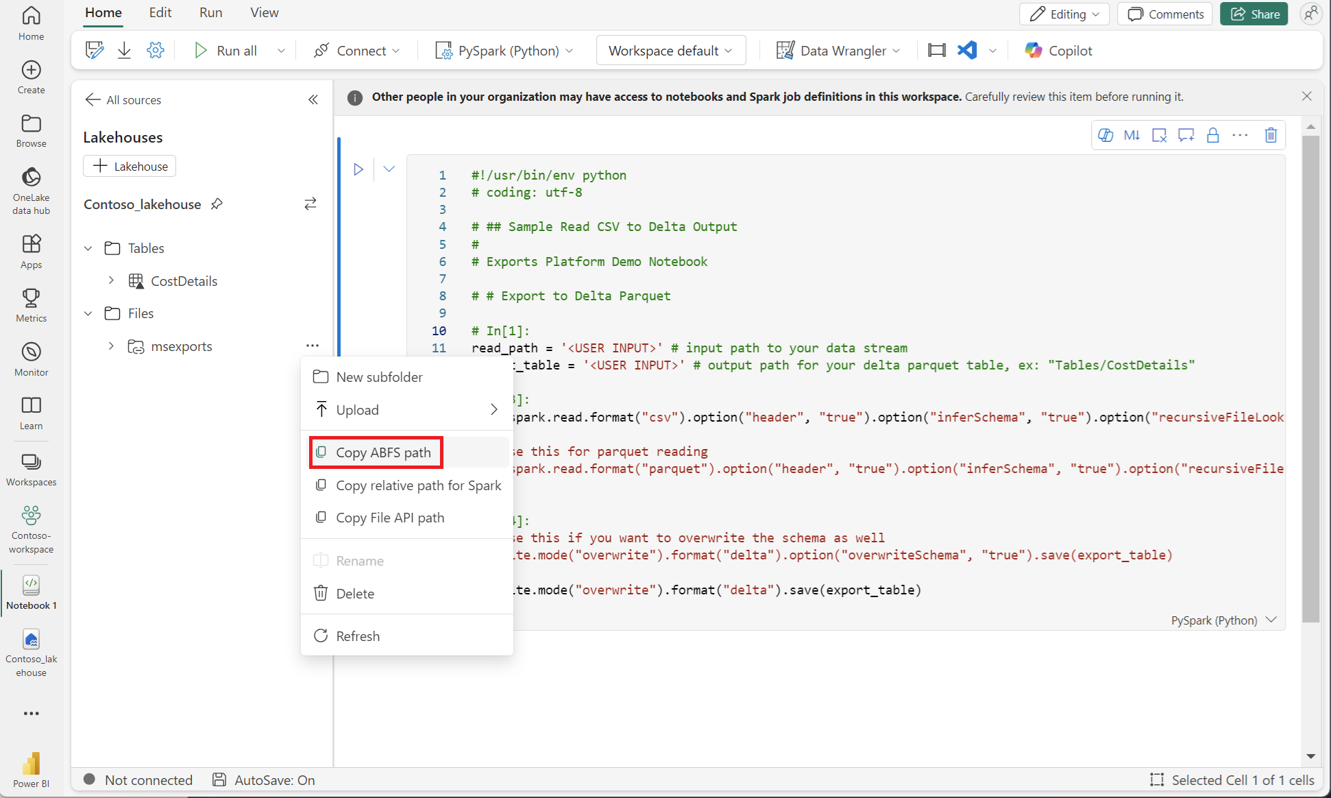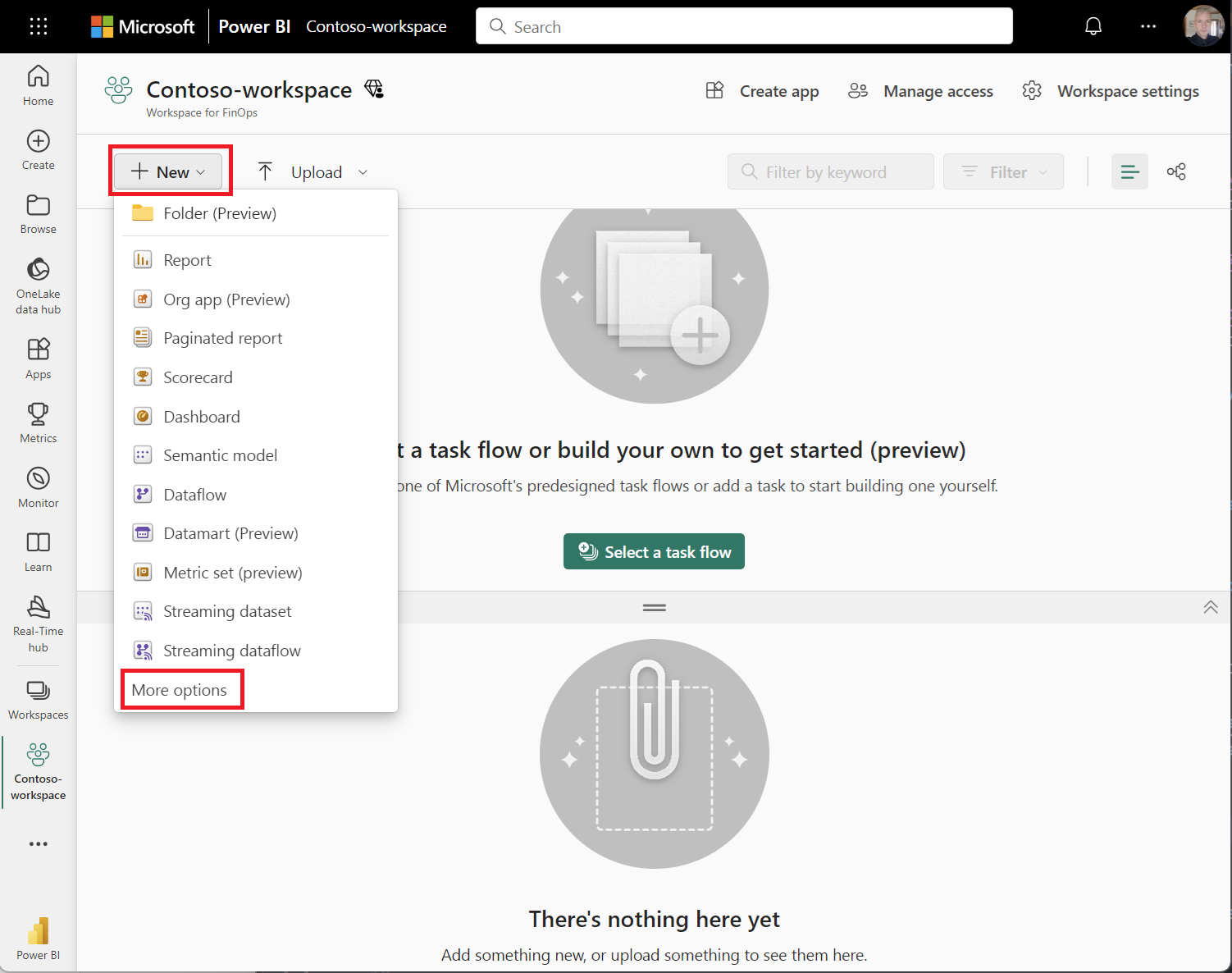 You can either create a new lakehouse or use an existing one. Lakehouses are interoperable so we would generally recommend using a single lakehouse for all your FinOps datasets. A single lakehouse keeps related information together to share data models, pipelines, and security measures.