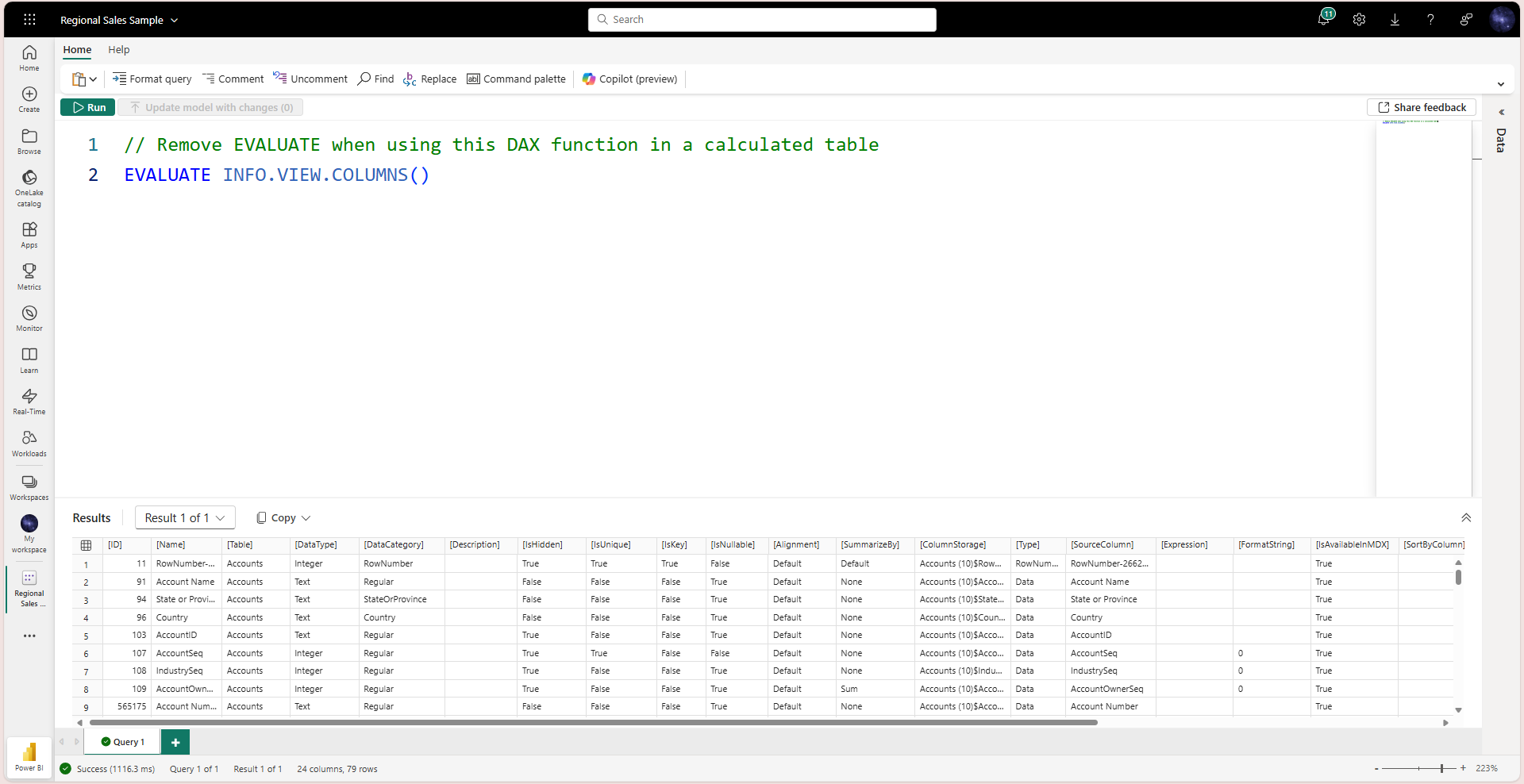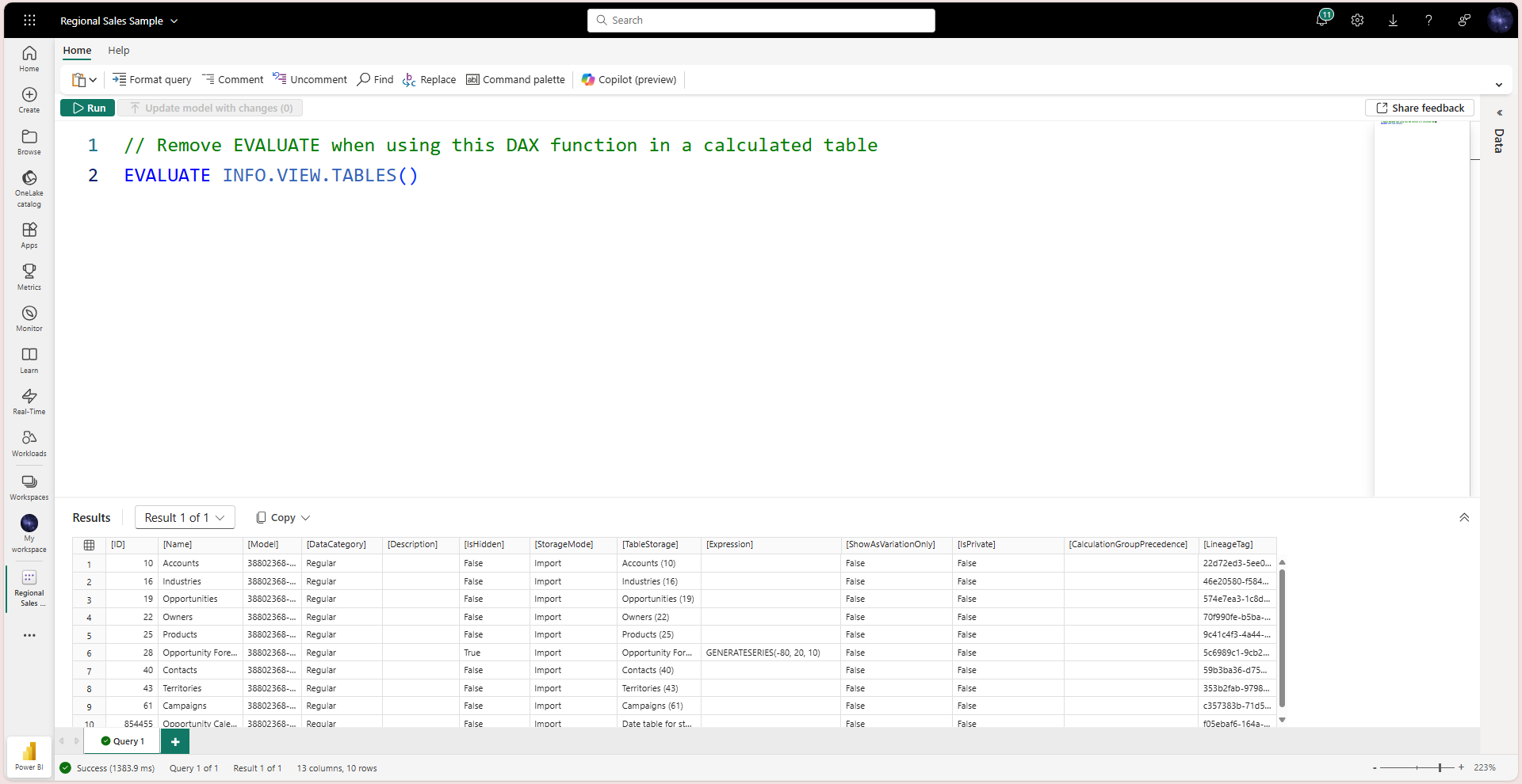 The following screenshot is an example of using this DAX function in DAX query view with the Regional Sales Sample available from Learn in the Power BI service.