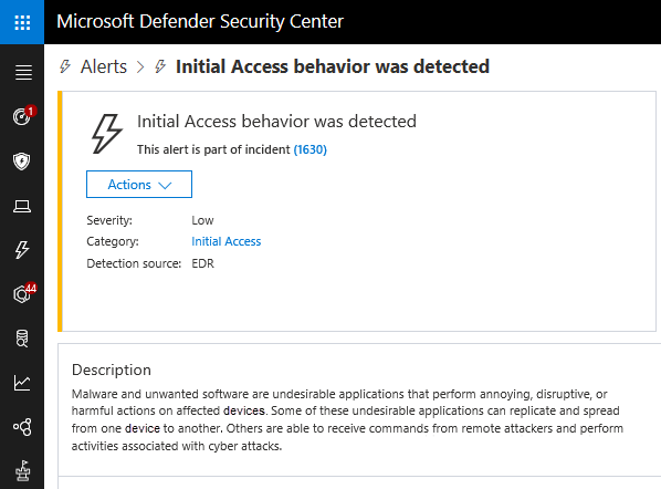 While the attack was detected and stopped, alerts, such as an "initial access alert," were triggered and appeared in the Microsoft Defender portal.