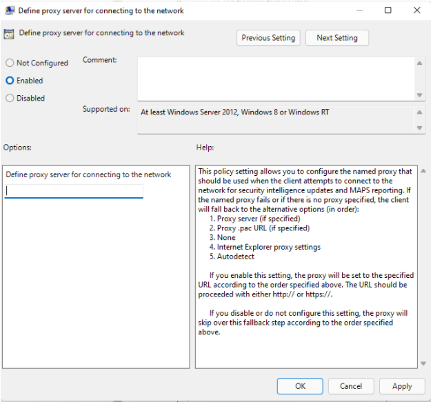 HKLM\Software\Policies\Microsoft\Windows Defender, the policy sets the registry valueProxyServerasREG_SZ.The registry value