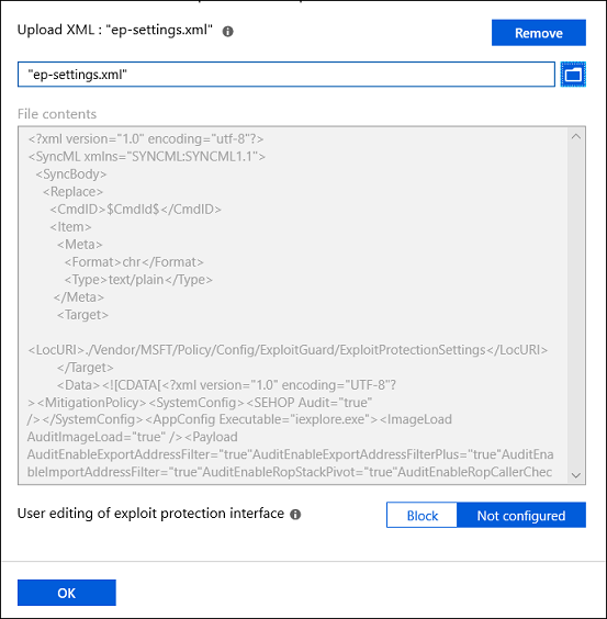 Upload an XML file with the exploit protection settings:
