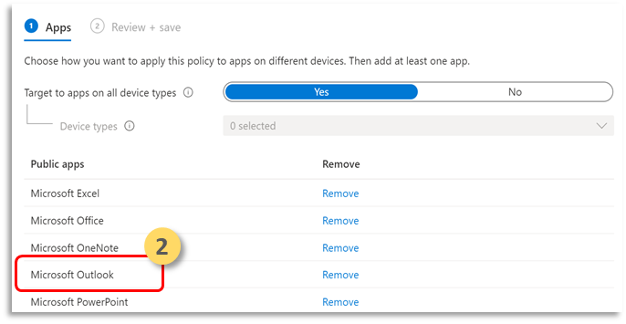 Use this option to specify whether this policy applies to unmanaged devices. You can also choose to target your policy to apps on devices of any management state. Because mobile app management doesn't require device management, you can protect company data on both managed and unmanaged devices. The management is centered on the user identity, which removes the requirement for device management. Companies can use app protection policies with or without MDM at the same time. For example, consider an employee that uses both a phone issued by the company, and their own personal tablet. The company phone is enrolled in MDM and protected by app protection policies while the personal device is protected by app protection policies only.b. Select Apps.