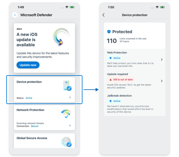 One feature card called Device Protection lists Web Protection, Device Health, and Jail Break. Previously, the dashboard had one card for each set of capabilities. In the new experience, only the Device Protection card changes.