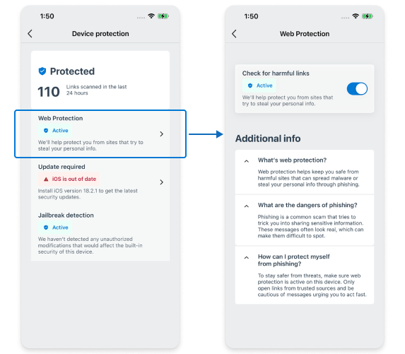 We're pleased to introduce the Device Protection feature card for our enterprise users that includes Web Protection, Device Health and Jail break feature that has been designed to be more user-friendly and accessible. The updated feature cards now include recommendation cards. The first recommendation card will prominently display any active alerts, ensuring you stay informed. Additionally, a list of features will now be presented in the form of tiles as a part of L2 screens enhancing ease of use and navigation.