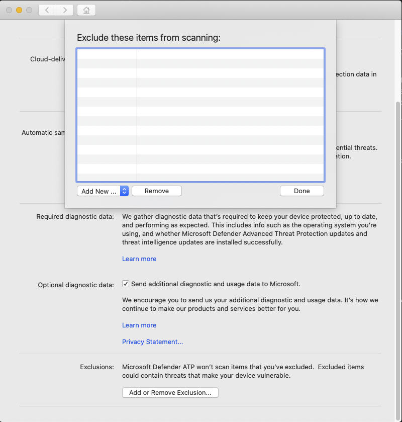 For more information on how to configure exclusions from JAMF, Intune, or another management console, see Set preferences for Defender for Endpoint on Mac.
