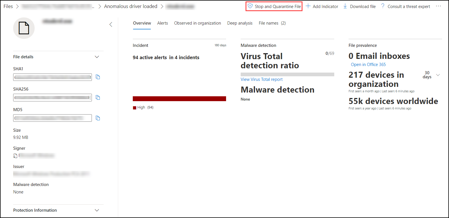 To ensure the file remains blocked beyond the timeout or after the action completes, it's recommended to create an indicator to block the file explicitly.Go to the top bar and select Stop and Quarantine File.