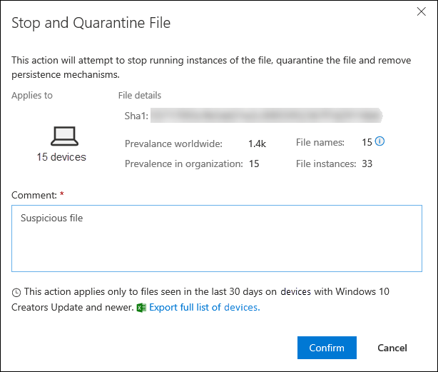 The stop and quarantine file action is limited to a maximum of 1000 devices. To stop a file on a larger number of devices, see Add indicator to block or allow file.