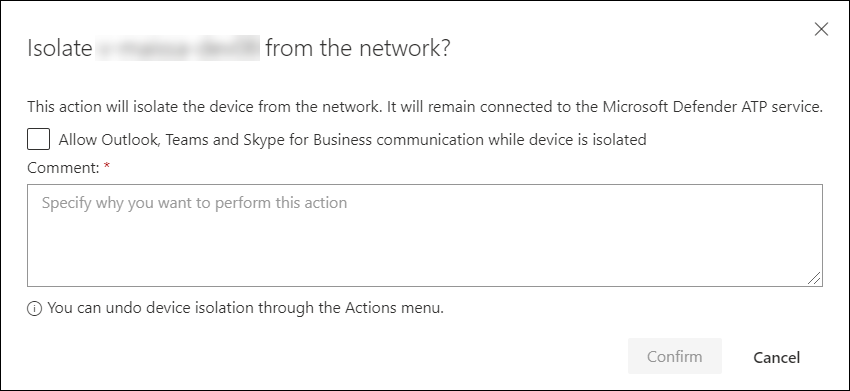 Once you have selected Isolate device on the device page, type a comment and select Confirm. The Action center shows the scan information and the device timeline include a new event.
