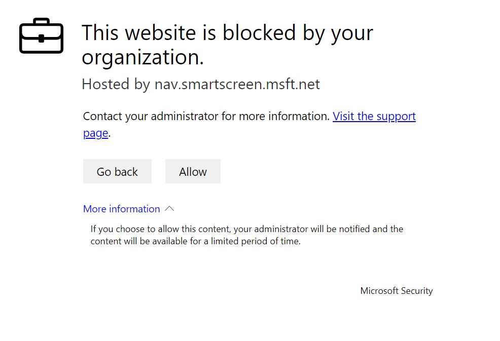 If a user visits a web page that poses a risk of malware, phishing, or other web threats, Microsoft Edge displays a block page that resembles the following image: