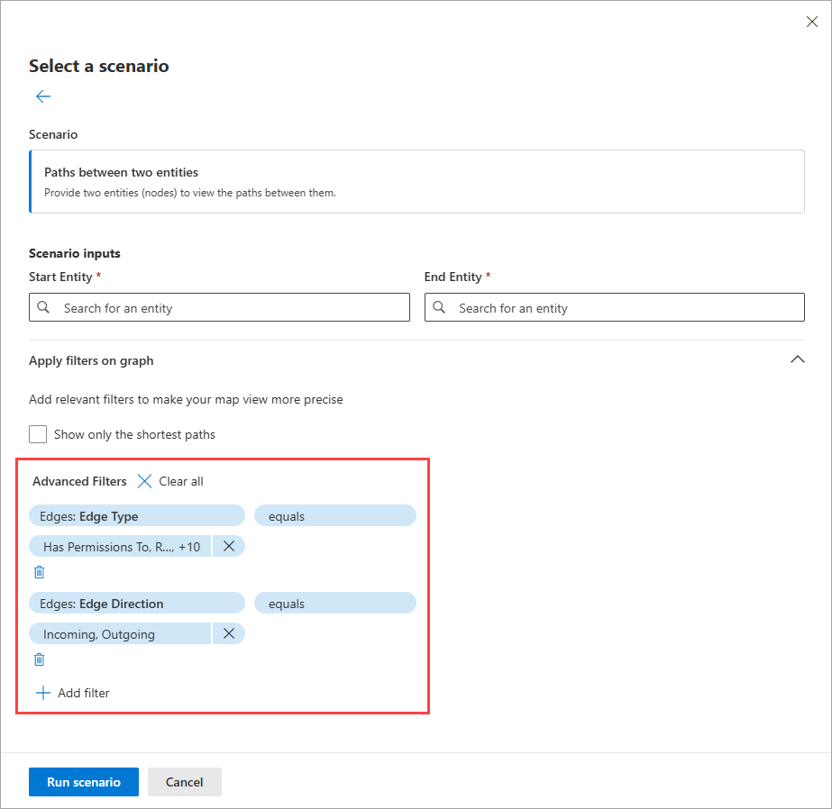 To add a filter, select Add filter then the select any of the supported node or edge filters. The following table lists these supported operators and filters. Depending on your chosen scenario, some of these filters might not be available as options.