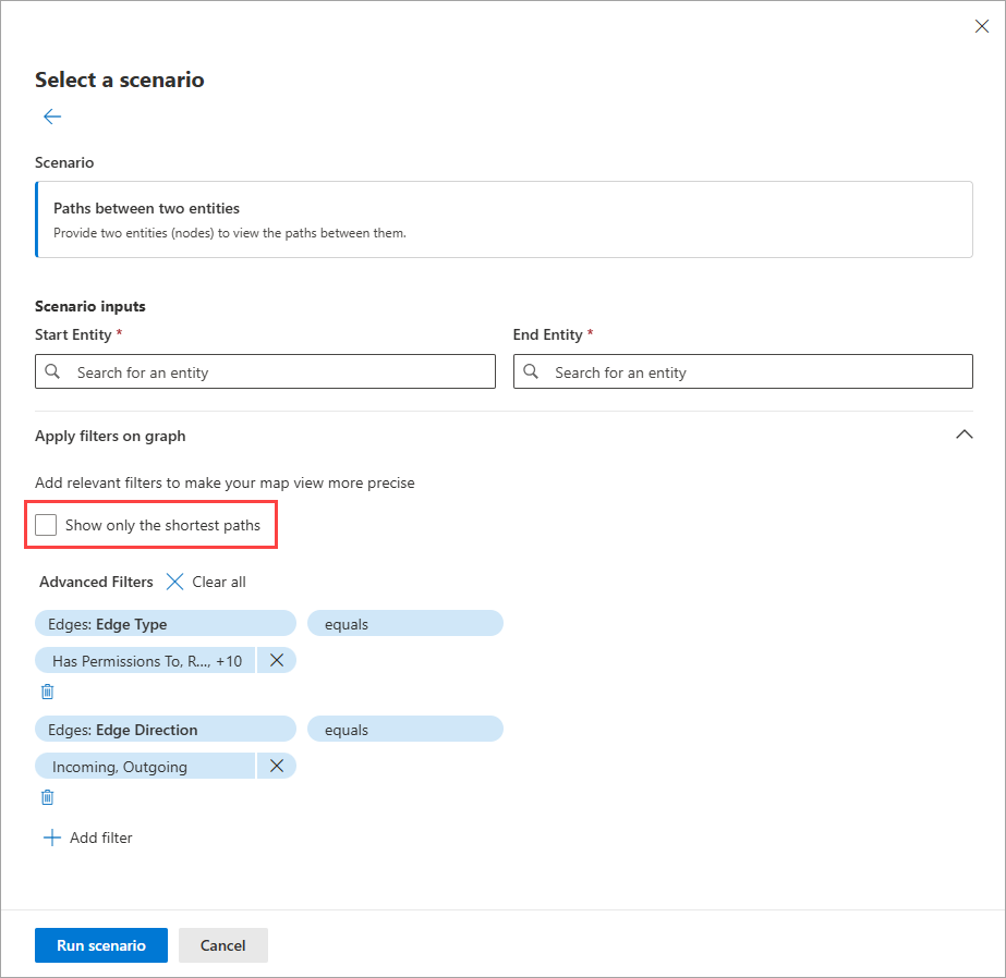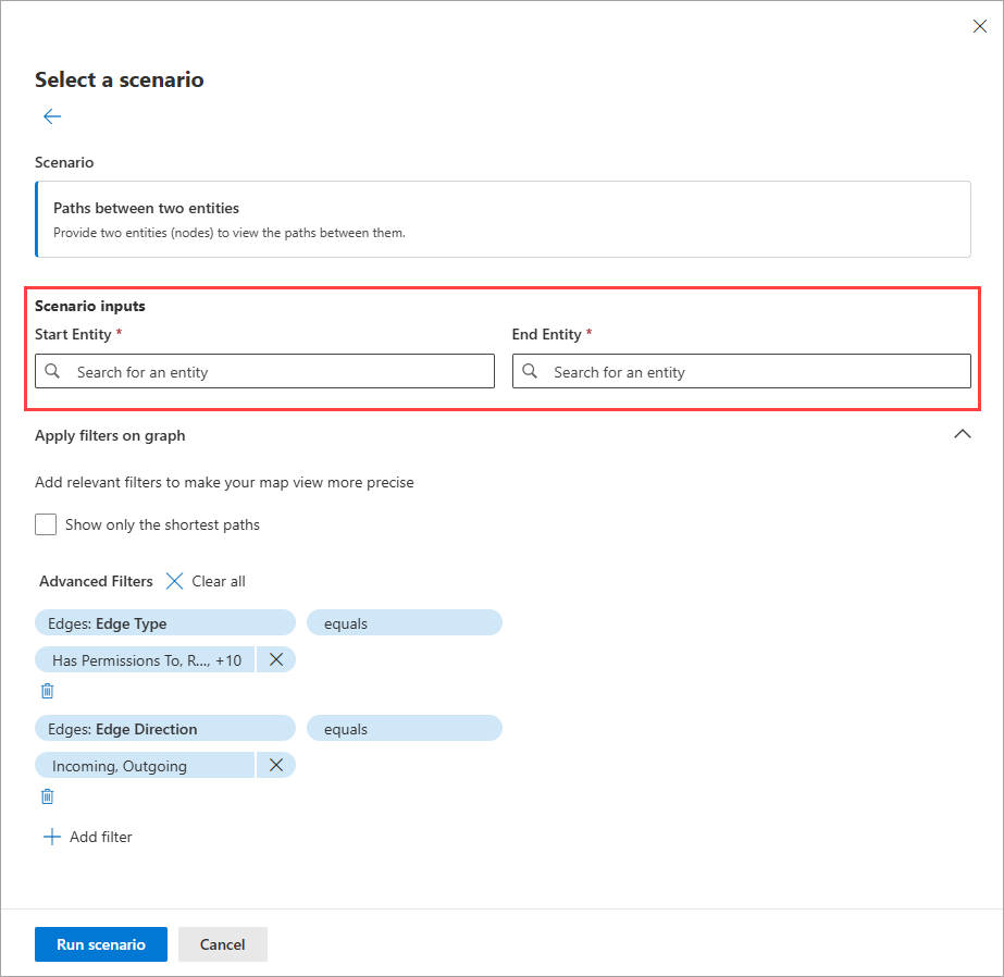 | Paths between two entities | Provide two entities (nodes) to view the paths between them. Use this scenario if you want to discover if there’s a path leading from one entity to another. |