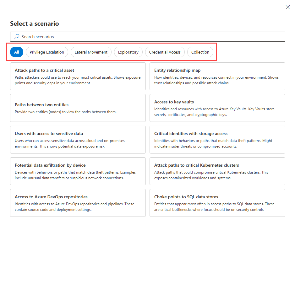 | Access to key vaults | Provide a specific key vault to view paths from various entities (devices, virtual machines, containers, servers, and others) that have direct or indirect access to it. Use this scenario in case of a breach, maintenance work, or assessment of the impact of entities that might have access to a sensitive asset like a key vault. |