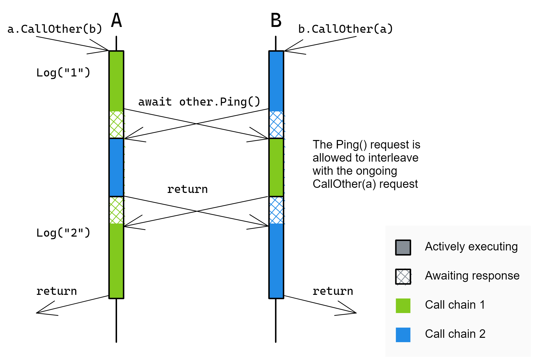 While A awaits the call to B, it can't process any incoming requests. As a result, if A and B were to call each other simultaneously, they might deadlock while waiting for those calls to complete. Here's an example, based on the client issuing the following call: