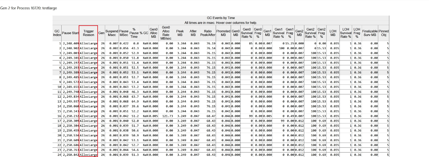 As you can see, all GCs are generation 2 GCs, and they are all triggered by AllocLarge, which means that allocating a large object triggered this GC. We know that these allocations are temporary because the LOH Survival Rate % column says 1%.