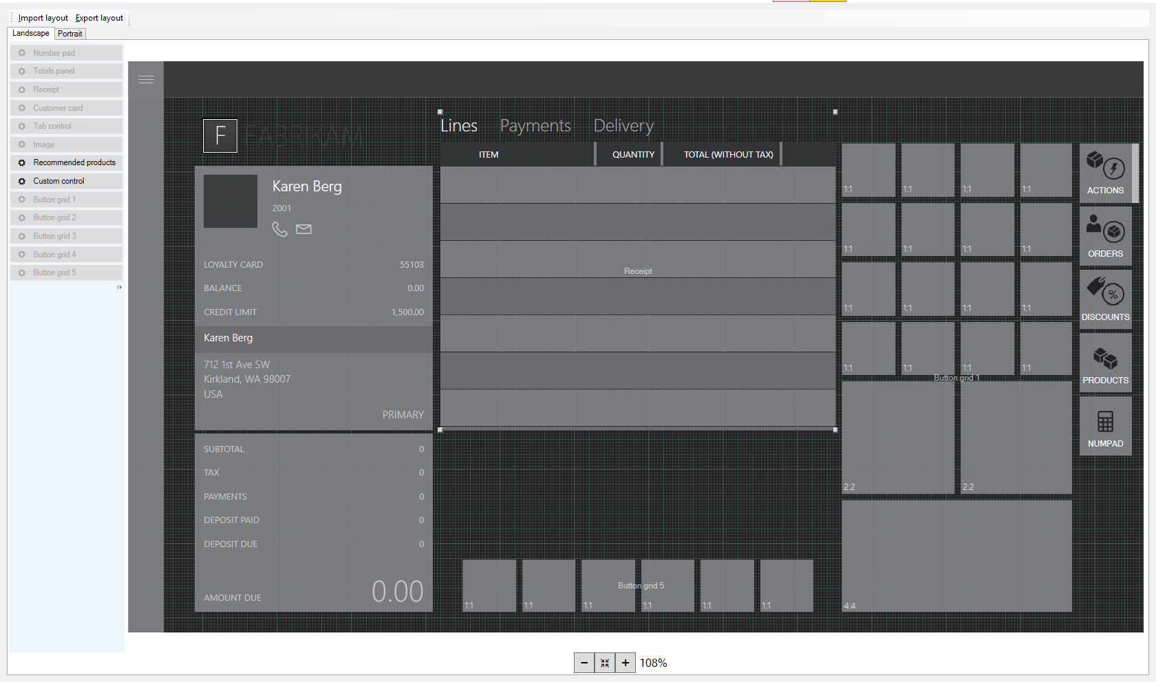 From the menu on the left, drag and drop the recommendations control to the space between the transaction line details area and the button grid in the center bottom of the transaction screen. Resize the control so it fits in that space.