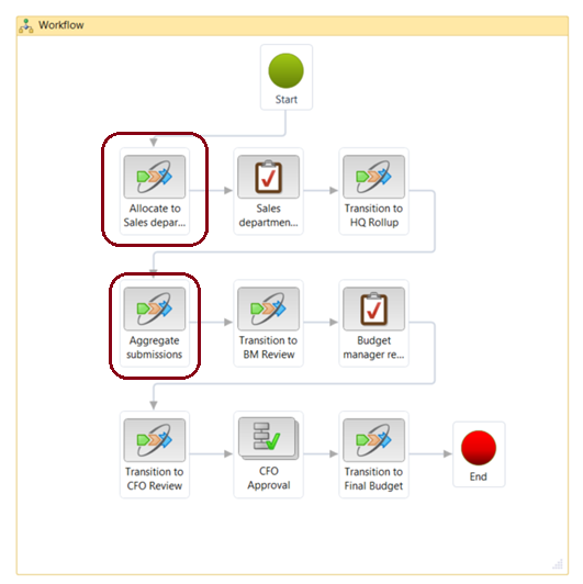 Finally, add an automated task for budget planning stage allocation at the desired workflow stage. In the following example, two budget planning stage allocations (outlined in red) have been inserted into the workflow.