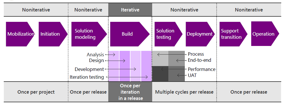 It's a popular and recommended methodology for Dynamics 365 projects. It uses a noniterative approach for the initial and final activities of the project, such as initiation, solution modeling, system integration testing, user acceptance testing, and deployment. It uses an iterative approach for the build activities of the project, such as requirement detailing, design, development, and testing.