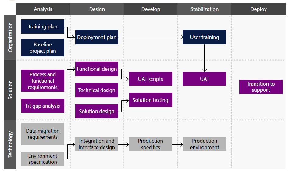 An example of the waterfall model as prescribed in Sure Step Methodology is shown in the following diagram: