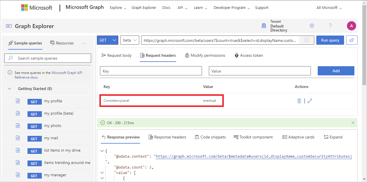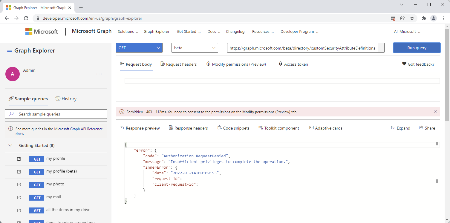 When you try to use Graph Explorer to call Microsoft Graph API for custom security attributes, you see a message similar to the following:
