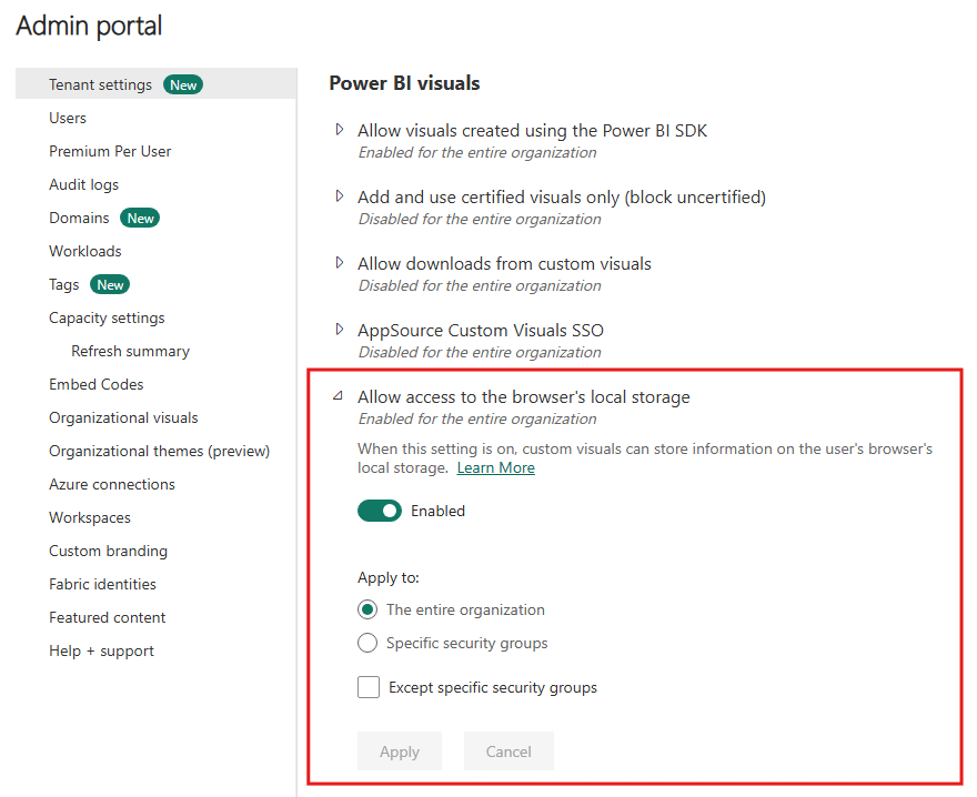 This setting enables visuals to store data on the browser's local storage which helps improve performance. This setting is separate from and not affected by download restrictions applied in your organization's export and sharing tenant settings. The setting is enabled by default and applies to all visuals, including those visuals managed by your organizational store, Desktop, and web.