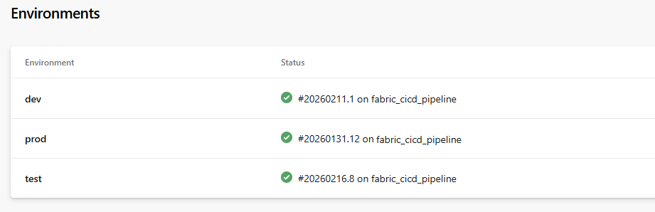| 2 | Microsoft Fabric Workspaces | Three workspaces — one each for dev, test, and prod |