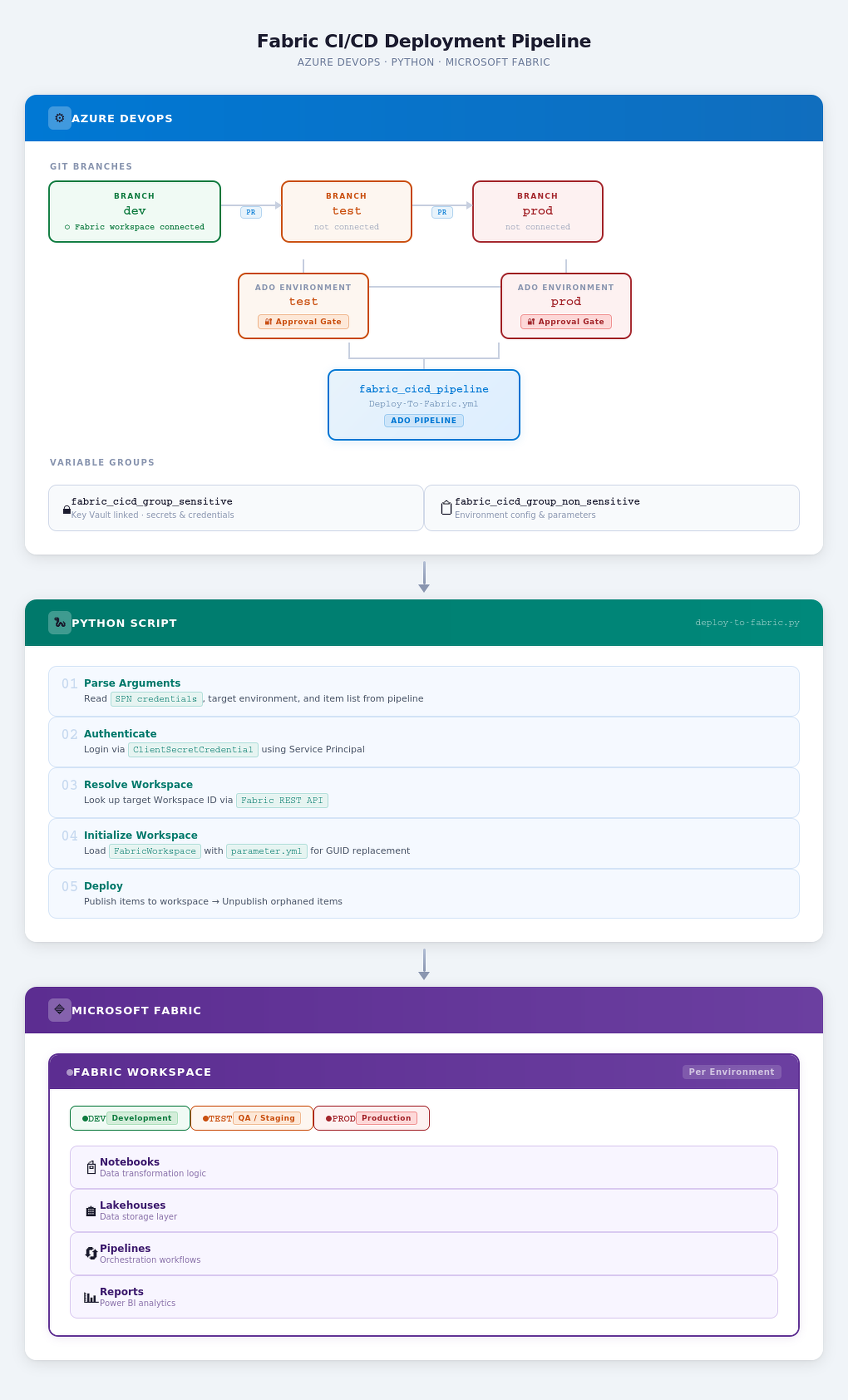 | Python Script | Authenticates via SPN, resolves workspace, deploys via fabric-cicd |