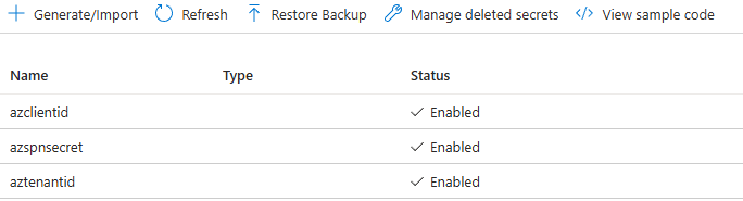 | 5 | Azure Key Vault | A Key Vault with three secrets: Tenant ID, Client ID, and Client Secret |